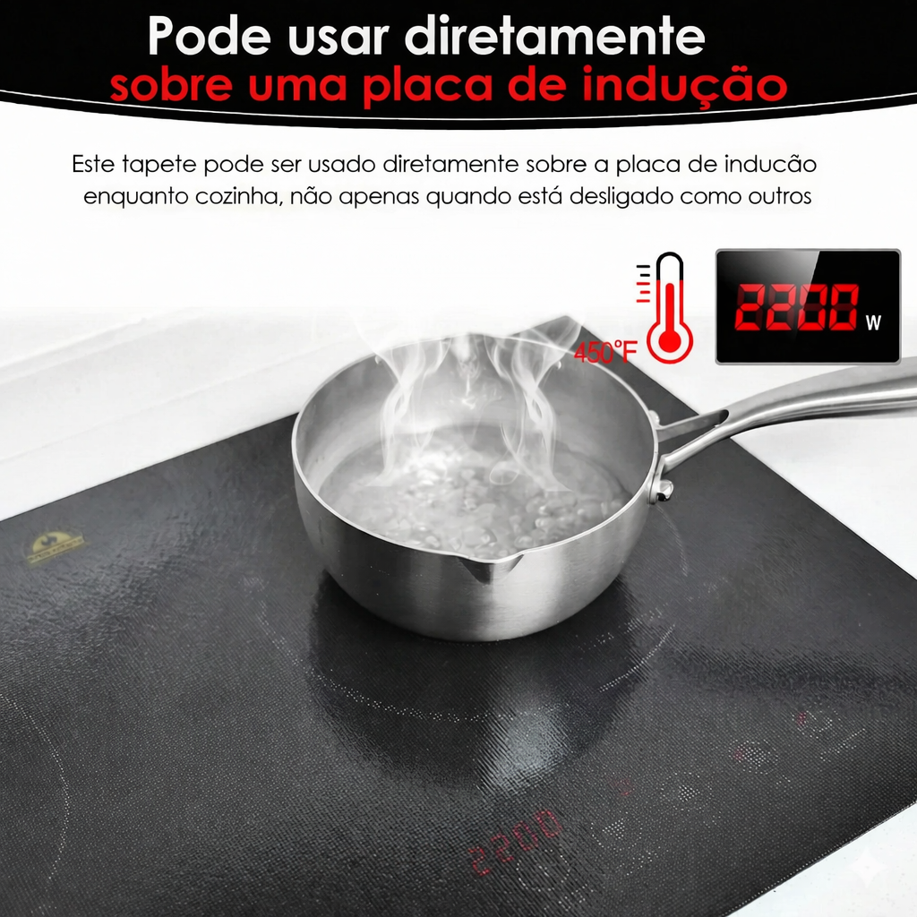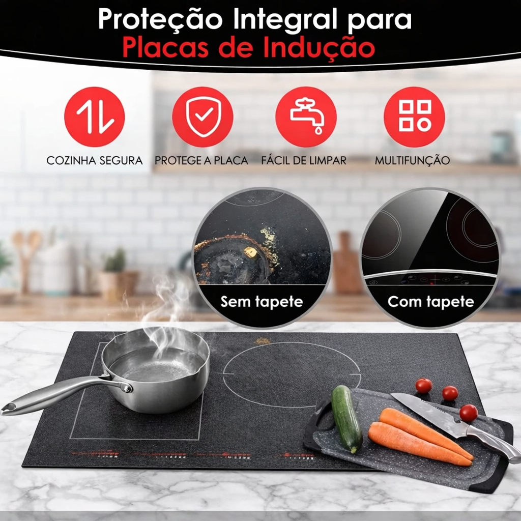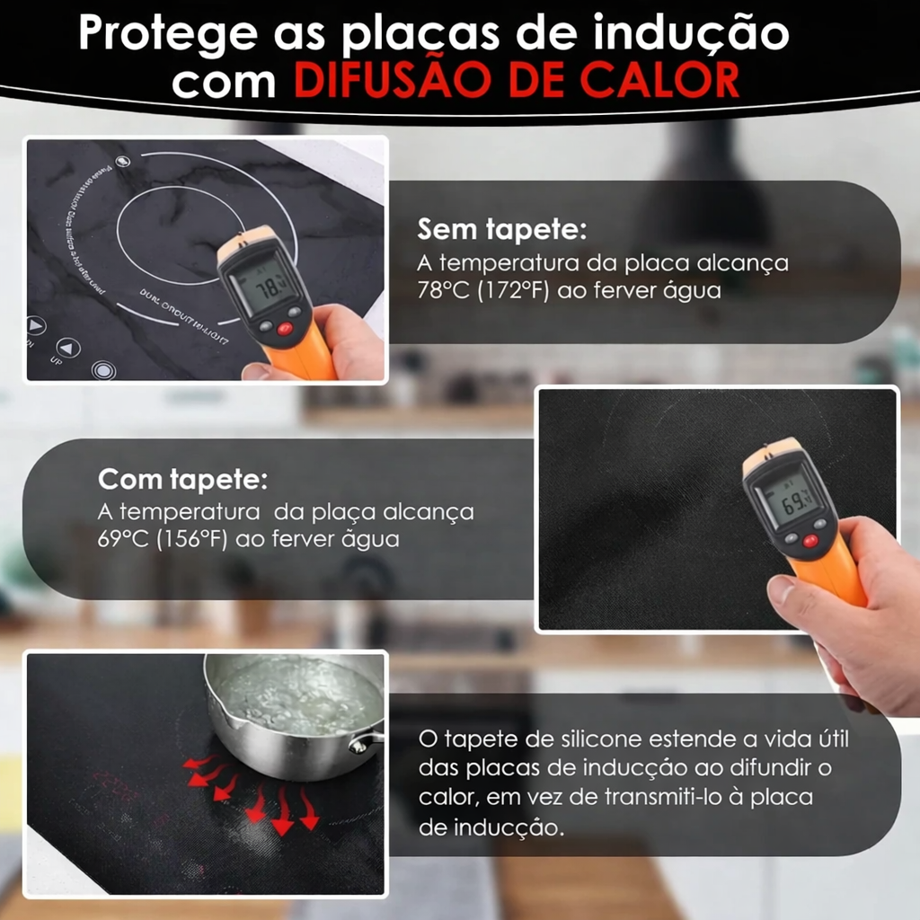 Fabricado em silicone de grau platina que suporta até 250 °C. Como a indução aquece o recipiente e não a placa diretamente, o protetor recebe apenas o calor residual, muito abaixo do seu limite de resistência.